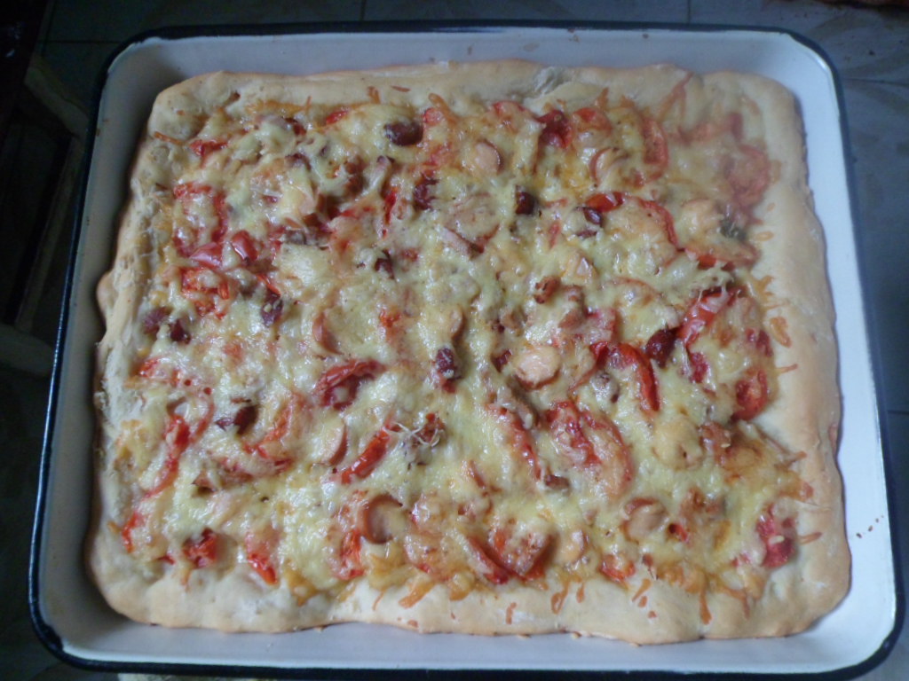 дольки 1помидора. Сверху посыпать крупно натертым сыром. Бортики пиццы