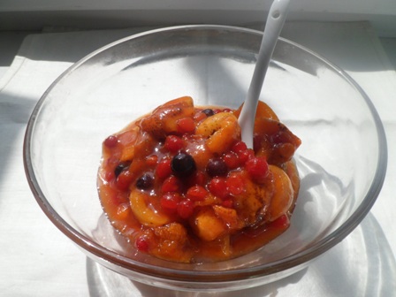 Вымытые фрукты: абрикосы, смородину, сливы, калину обработать. Из абрикос и слив удалить косточки, смородину очистить от веточек. Сложить в эмалированную ёмкость и всыпать сахар. Дать постоять, чтоб фрукты пустили сок. Затем поставить на маленький огонь и довести до кипения помешивая деревянной ложкой. Варить минут 10.Смотреть, чтобы не пригорело. Снять с огня.