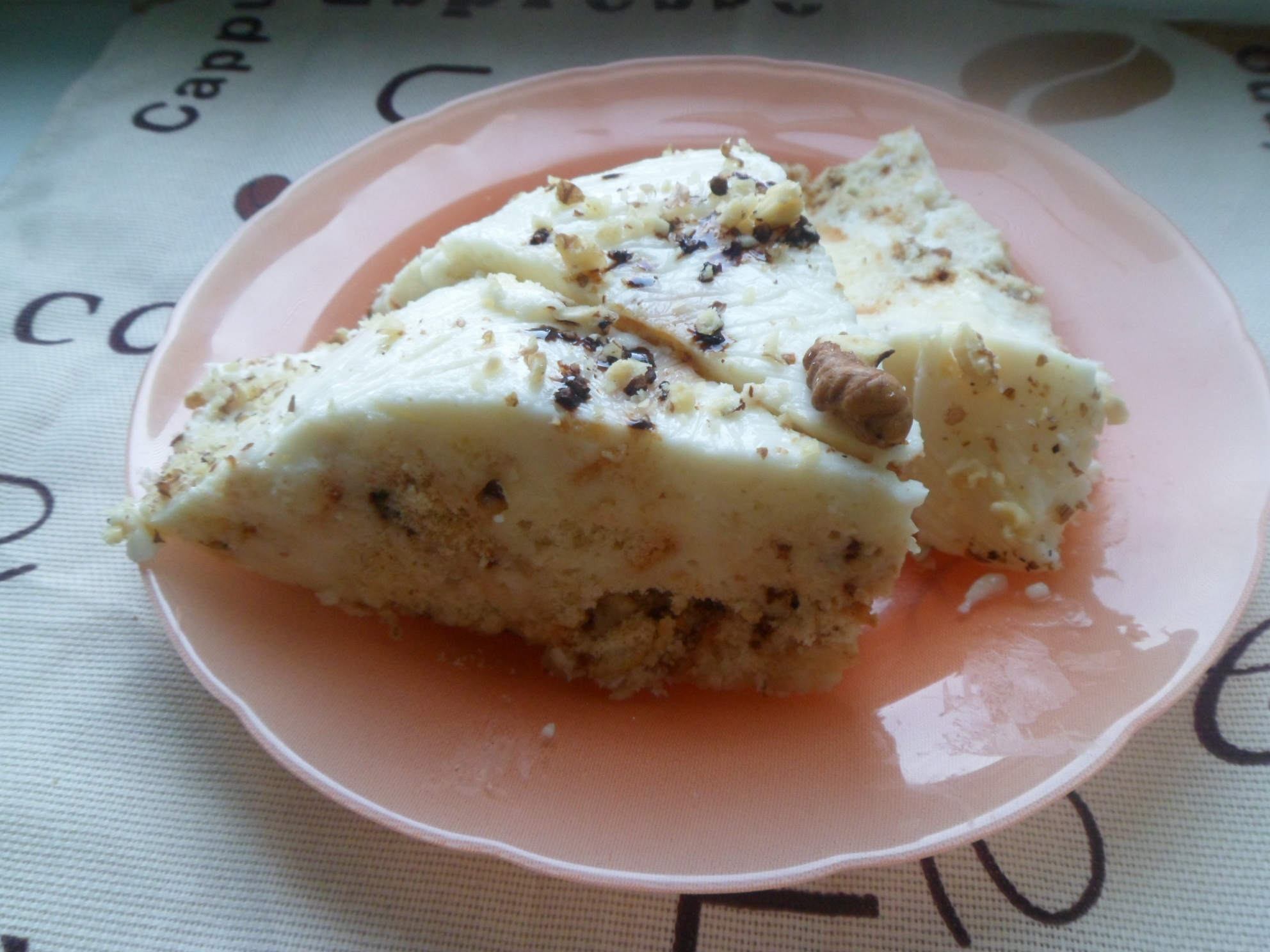 Когда десерт хорошо застынет перевернуть форму  на блюдо, удалить плёнку,украсить его орехами и небольшим количествам кофе. или по своему усмотрению.