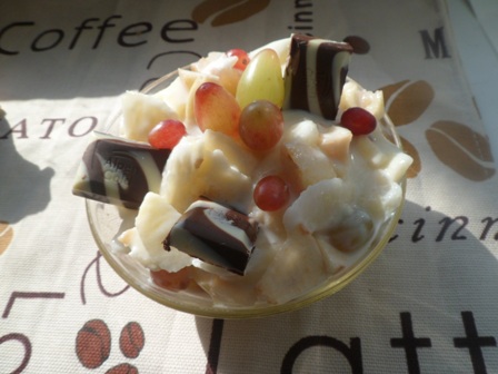 разных фруктов и есть их можно сколько угодно. Однако хочется что-то попробовать новенькое для себя. Например, подобный салат. Предлагаю и вам. Количество продуктов рассчитано на 2 порции. При желании можно брать больше.