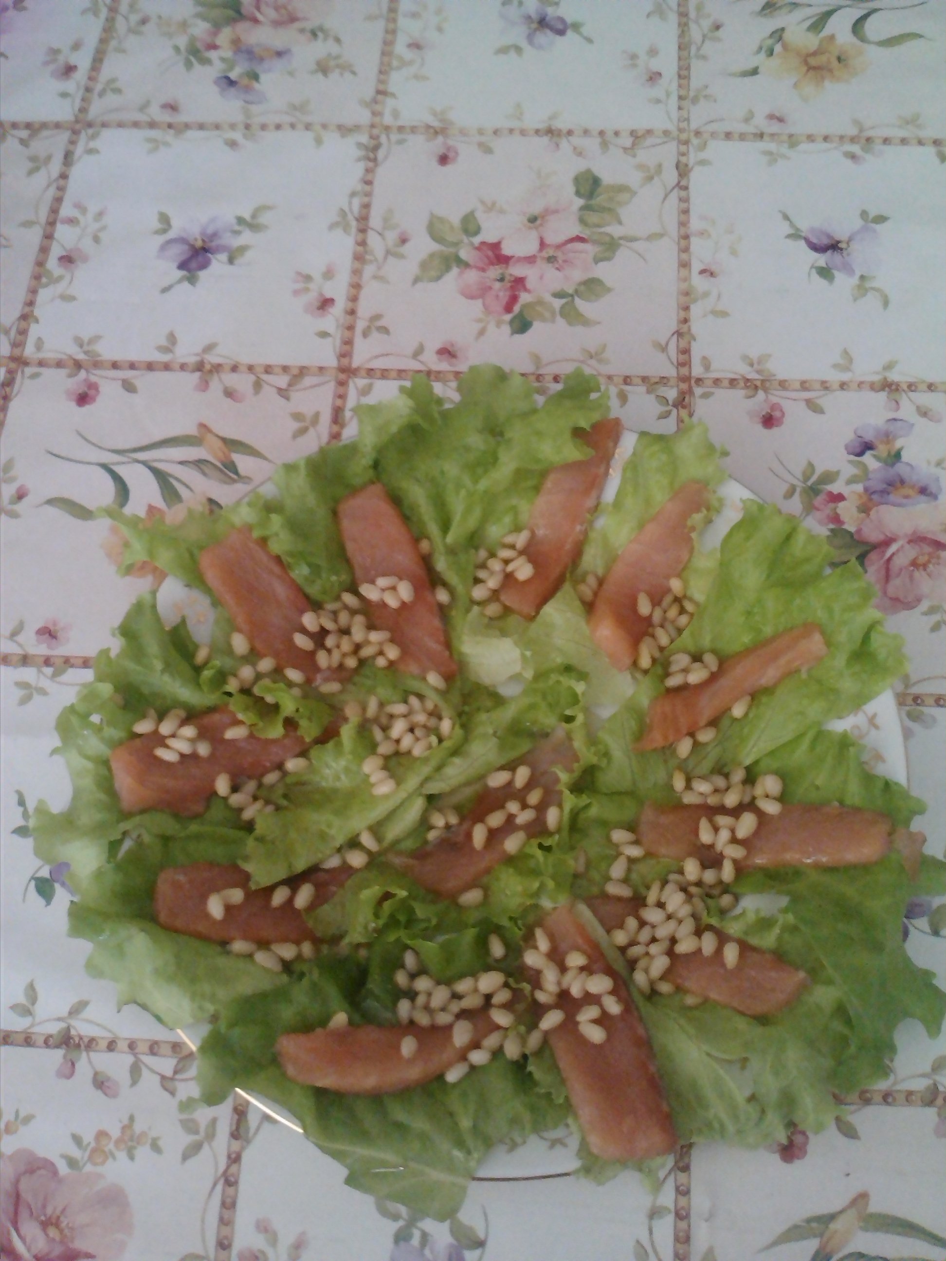 Украсить кедровыми орешками, которые можно предварительно слегка обжарить на сухой сковороде(1/2минуты). Количество указанных продуктов можно увеличить по вашему усмотрению. ПРИЯТНОГО АППЕТИТА!