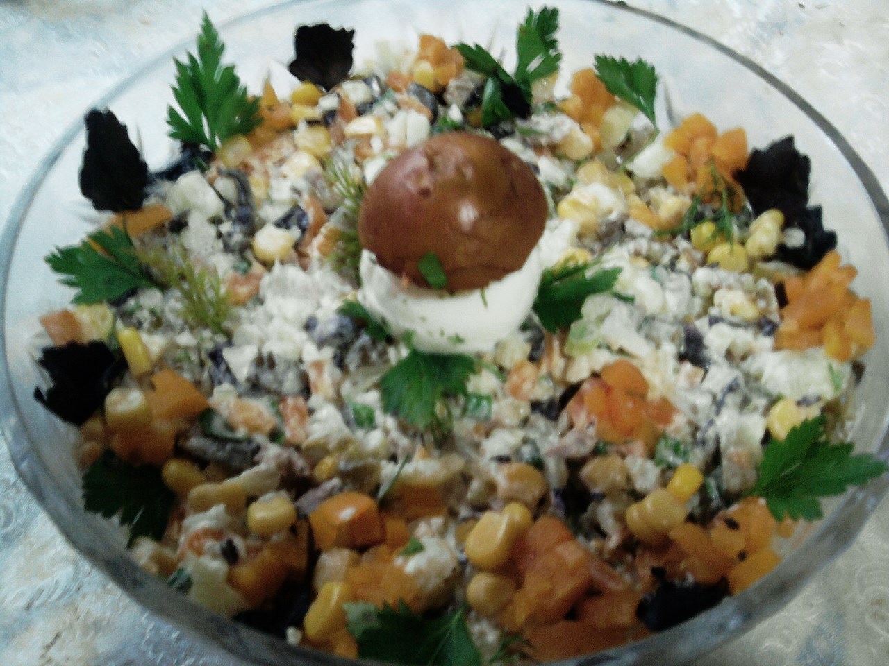 Посолить, поперчить по вкусу. Заправить небольшим количеством майонеза. Украсить консервированной кукурузой, зеленью петрушки и базиликом.