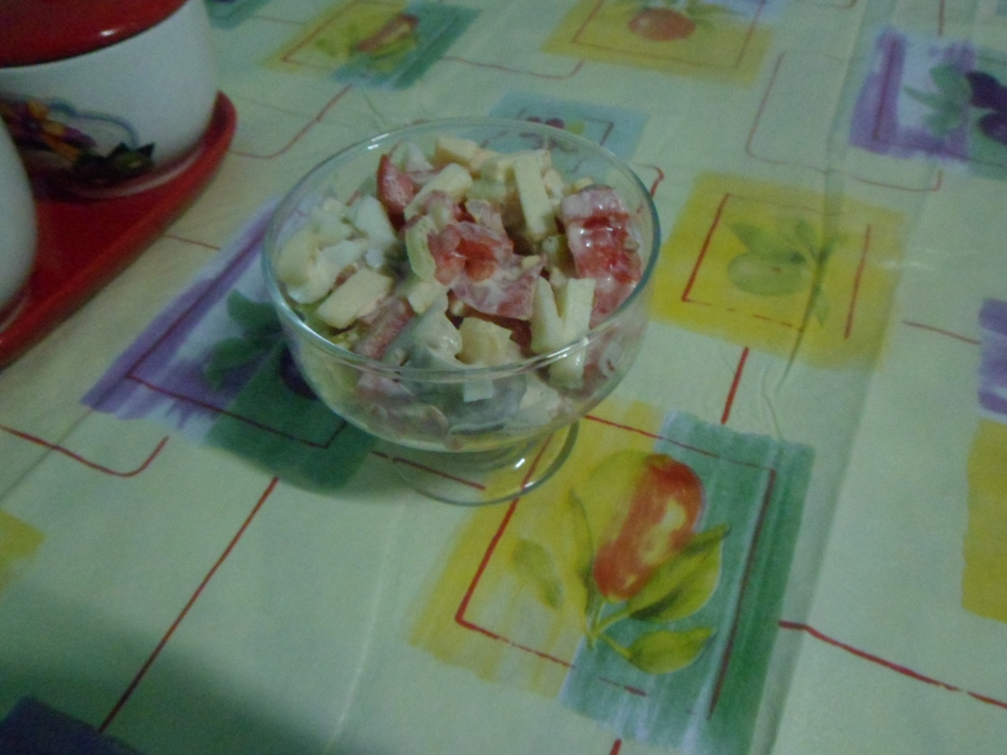 1-2 помидора свежих; 1 перец болгарский; 2 яйца варёных; майонез,соль по вкусу; зелень по желанию.