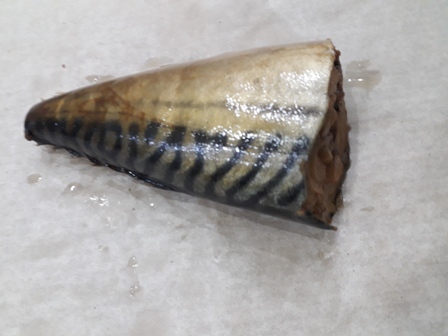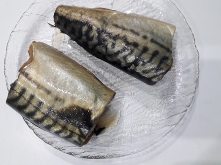 Cкумбрию  разморозить. Удалить хвост, голову, внутренности. Промыть. Обсушить немного. Если  рыба крупная, тушку можно разрезать на две половины.