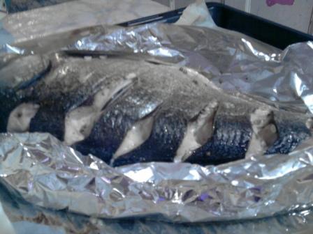 Рыбу почищенную ,выпотрошенную, вымыть и обсушить. Сделать 3-4 надреза поперёк тушки. Натереть солью и специями. Дать постоять минут 5. Смазать растительным маслом. Противень застелить фольгой. Фольгу слегка смазать растительным маслом. Подготовленную рыбу поместить на фольгу и поставить в разогретую духовку. Запекать примерно час-полтора. Чтоб рыбка не пересохла можно на некоторое время накрыть её фольгой. За 10-15 минут до готовности фольгу с рыбы убрать. При подаче украсить зеленью укропом нарезанным чесноком.