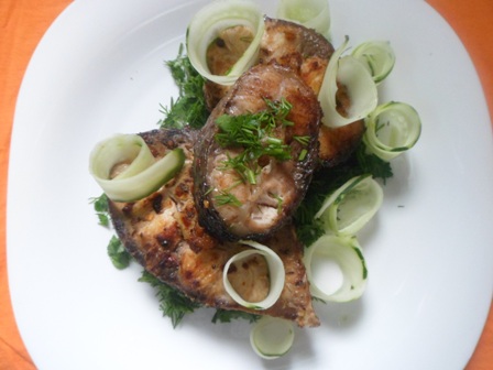 Обработанную речную рыбу обсушить салфеткой. Разрезать на куски по 4см. Каждый кусок слегка натереть солью, смешанной с сушеным пряными приправами. И жарить на сковороде с раскаленным маслом с обеих сторон до румяной корочки. Выложить на блюдо. Украсить по вкусу.