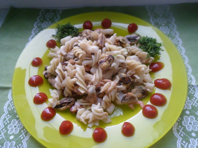 ЗАМЕТЬТЕ! При смешивании макарон и морепродуктов вы можете добавить больше или меньше макарон. От этого вкус морепродуктов будет больше или меньше соответственно.