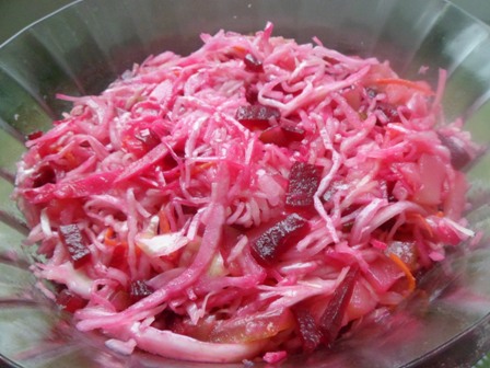винегрет. Добавить порезанную соломкой или кубиками свеклу, солёный