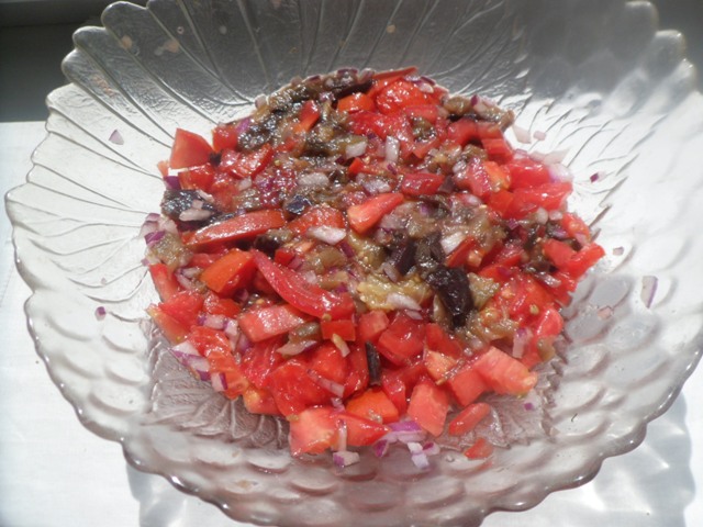 Вымыть баклажаны. Отварить их целиком в кипящей воде. Выложить баклажаны на блюдо или тарелку, надрезать по длине и дать стечь соку. При необходимости придавить пальцами для лучшего вытекания жидкости. Затем баклажаны нарезать квадратиками и положить в салатник. Нарезать квадратиками помидоры, лук измельчить. Прибавить к баклажанам в салатник. Посолить, всыпать сахар, уксус,(перец по желанию). Полить маслом, перемешать. Можно украсить зеленью. Перед подачей дать настояться 15 минут. ПРИЯТНОГО АППЕТИТА!