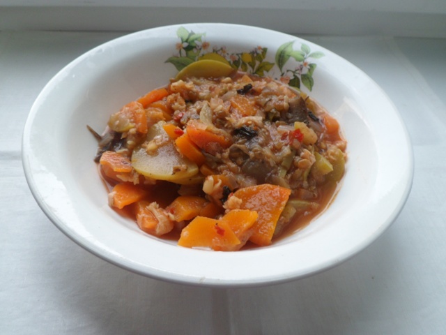 Кабачок - 2шт.; Морковь - 2шт; Перец болгарский -1 шт.; Лук репчатый - 1шт.; Масло растительное - 2-3ст.л.; Соль по вкусу; Паприка сушеная - 1 ст. л.; Томатная паста - 2ст.л.; Мята сушеная - 1 ст. л.; Базилик сушеный по вкусу.; Черный перец горошком, лавровый лист; 0,5 стакана маша (золотистой фасоли); 0,5 стакана геркулеса.