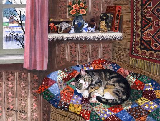 с кошками. А также с каминами, дающими тепло и согревающими человека. Еще с